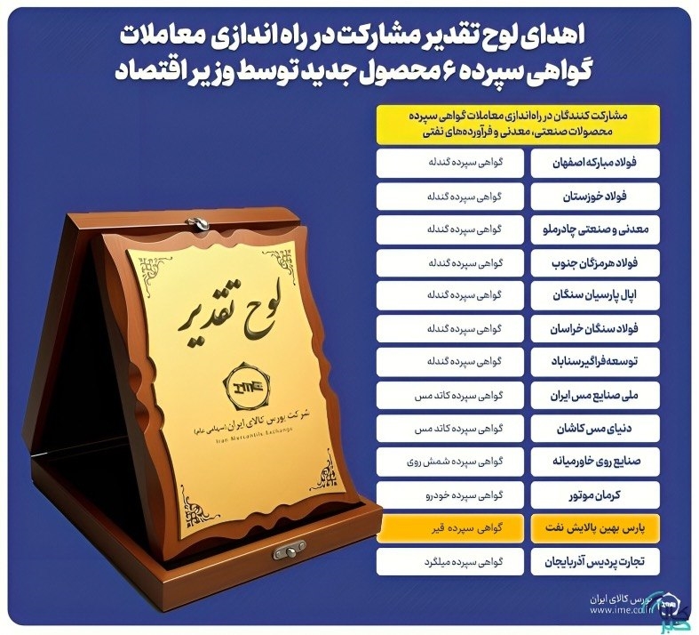 در بخش ویژه‌ سومین همایش برترین‌های بورس کالای ایران که با حضور وزیر امور اقتصادی و دارایی برگزار شد، ۱۳ شرکت تولیدی کشور به پاس نقش‌آفرینی در توسعه ابزارهای مالی مبتنی بر کالا و گسترش سرمایه‌گذاری مردمی در بازارهای کالایی، لوح تقدیر دریافت کردند.
