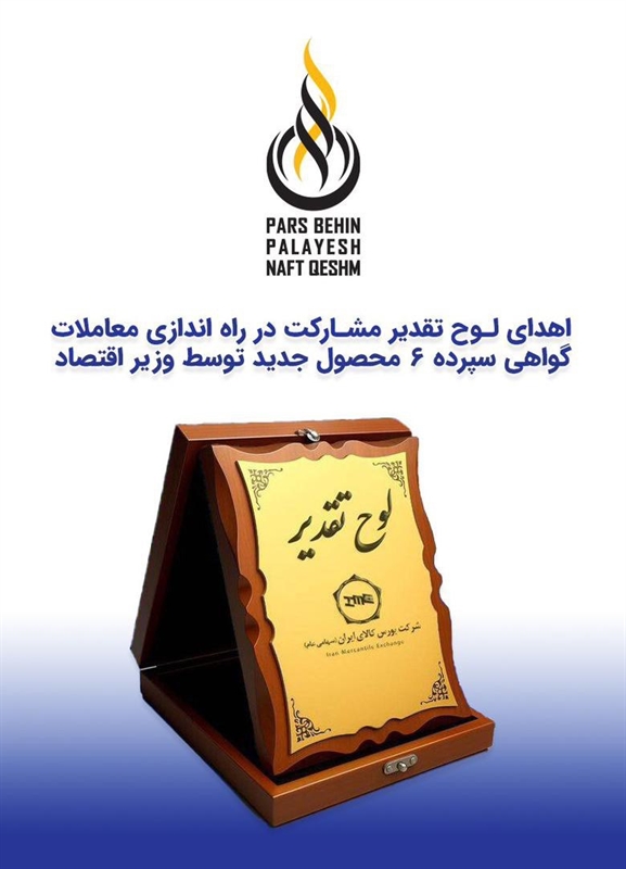 شرکت پارس بهین پالایش نفت قشم، از شرکت‌های زیرمجموعه گروه انرژی پاسارگاد، به پاس مشارکت مؤثر در توسعه بازار مالی بورس کالا و نقش‌آفرینی در راه‌اندازی معاملات گواهی سپرده کالایی قیر، از سوی وزیر امور اقتصادی و دارایی مورد تقدیر قرار گرفت و لوح سپاس دریافت کرد.