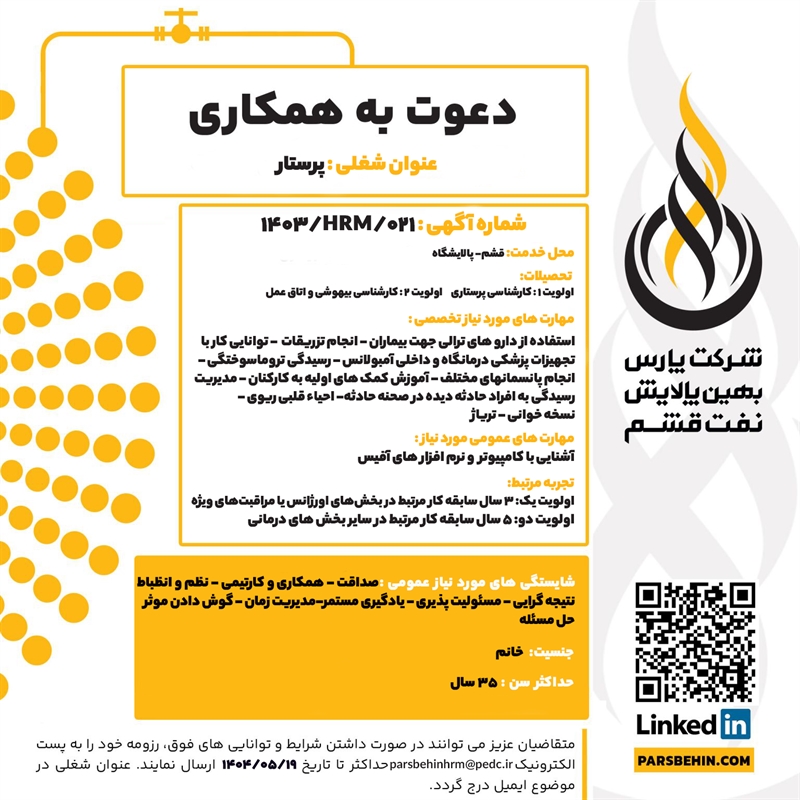 * متقاضیان عزیز می توانند درصورت داشتن شرایط و توانایی های فوق، رزومه خود را به آدرس الکترونیک parsbehinhrm@pedc.ir حداکثر تا تاریخ 1404/05/19 ارسال نمایند. عنوان شغلی در موضوع ایمیل درج گردد.